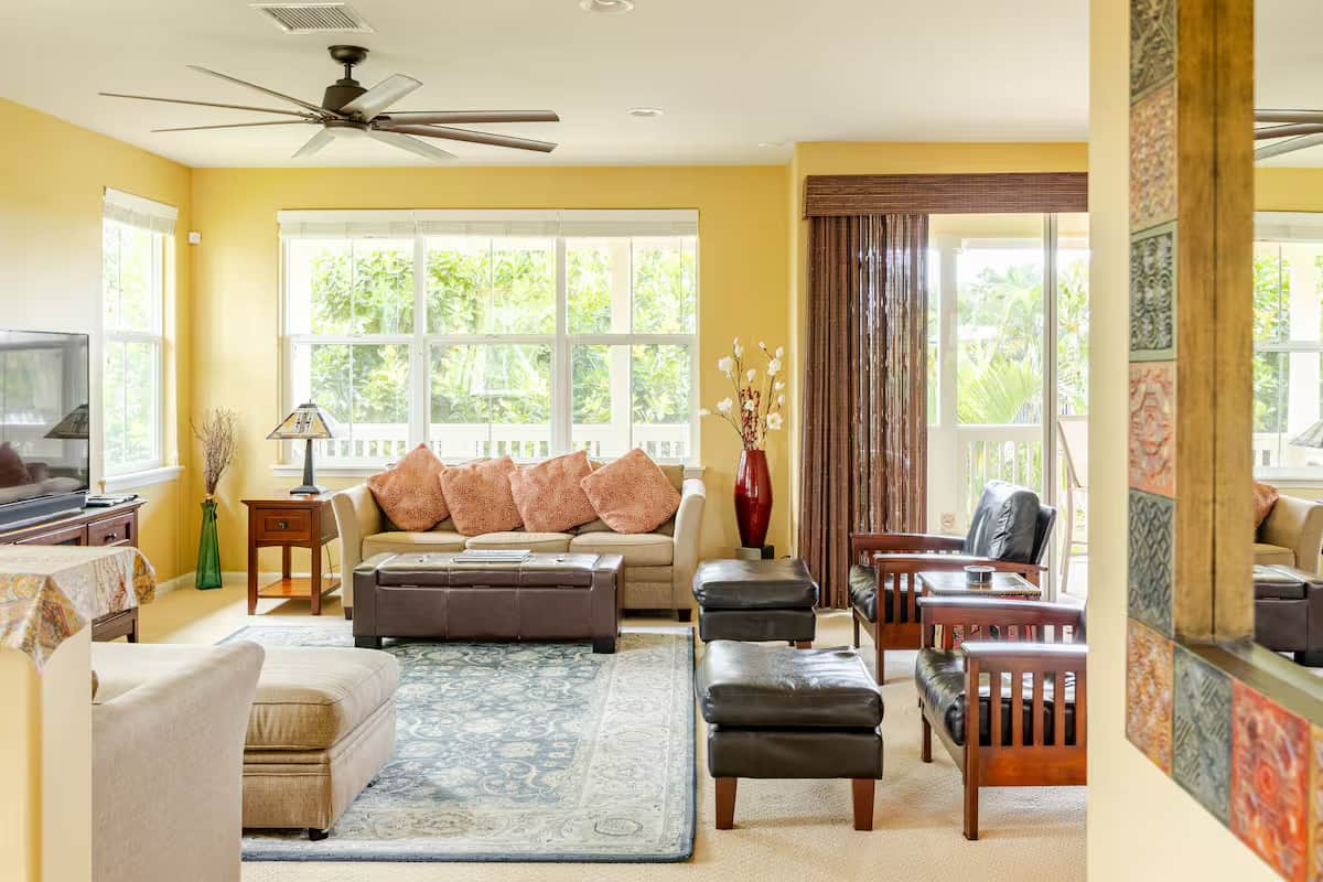 The open-concept living and dining areas create a warm, inviting space for family gatherings. Cozy up in the comfortable living room for movie nights or fun game sessions. Step out onto the main lanai to feel the gentle ocean breeze and immerse yourself in the calming sounds of the fountain by the lanai.